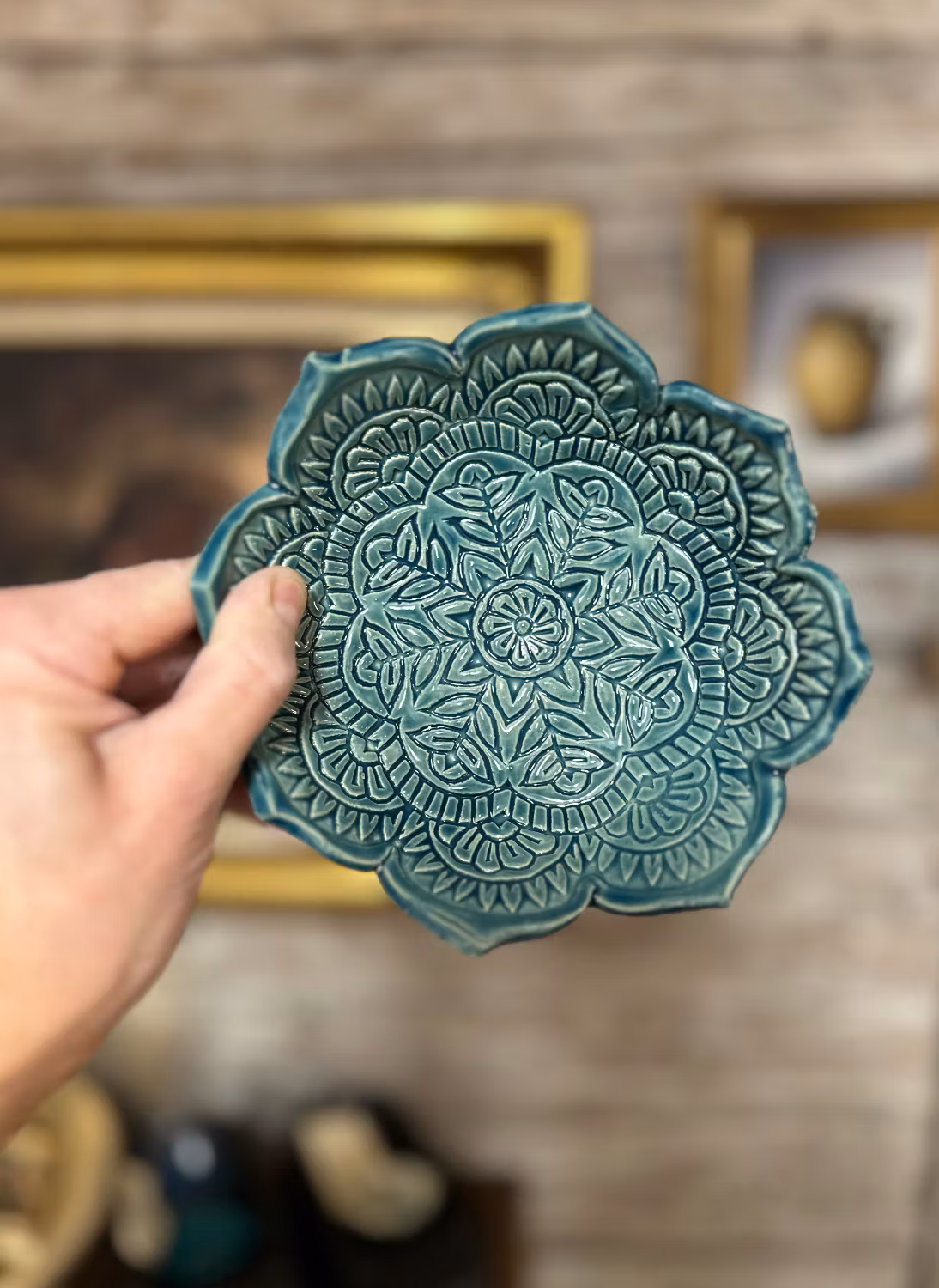 Hem › Produkter › Skål ’Frida’ Skål ’Frida’ 0 kr 99 kr Skål med spetsmönster. Varje skål är handgjord och kan därför skilja sig åt något.Storlek: ca 14cm i diametern - höjd ca 4cmFärg: Turkos